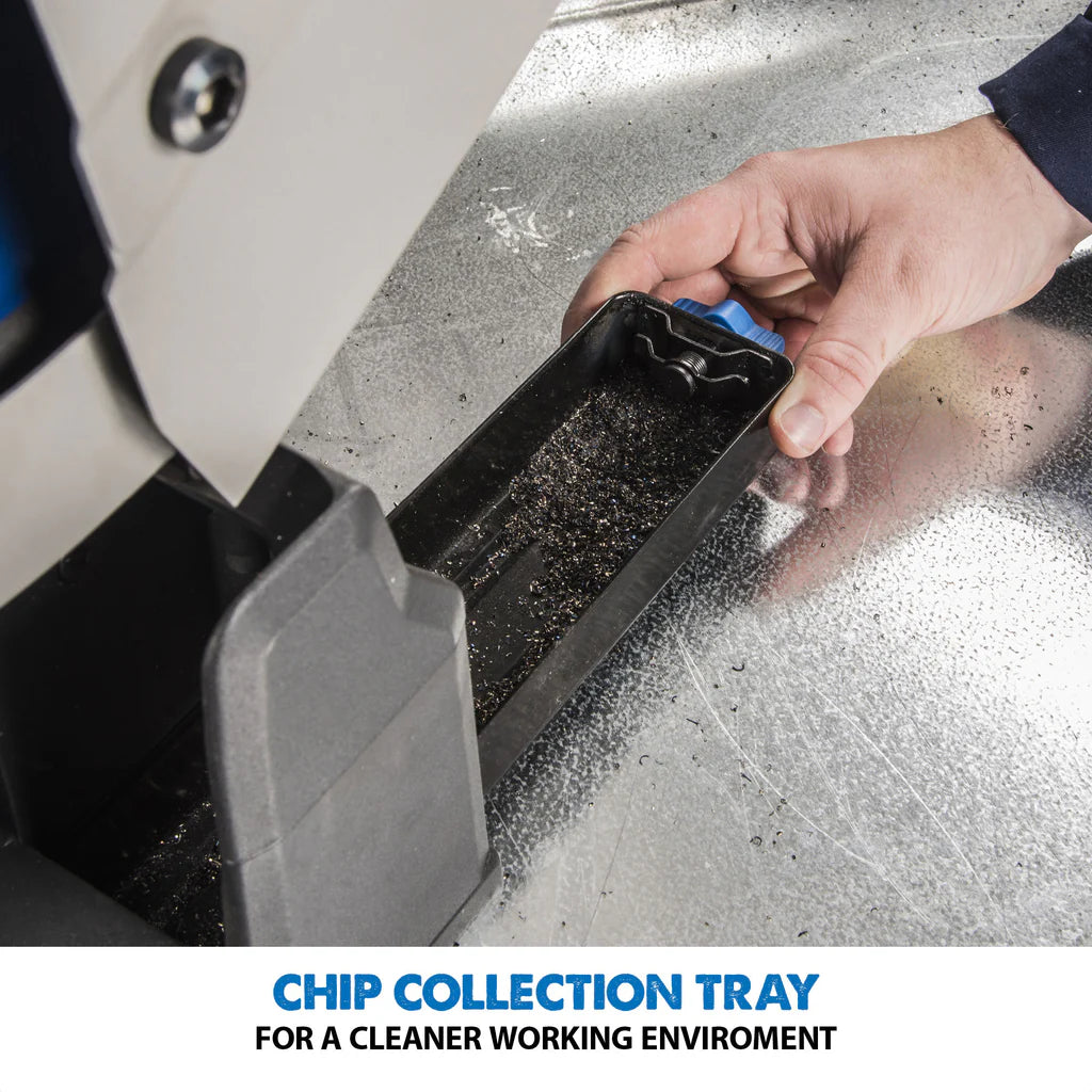 - Chip collection tray for a cleaner, safer working environment